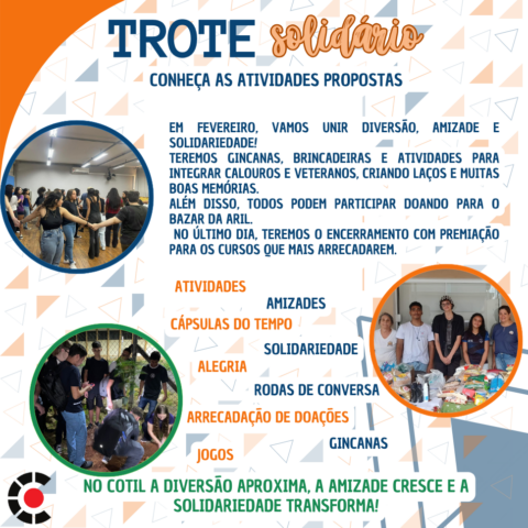 O Trote Solidário é uma ação especial que une integração, diversão e solidariedade entre alunos ingressantes e veteranos do colégio. Ao longo do mês de fevereiro de 2026, serão realizadas diversas atividades de integração, como gincanas, jogos e dinâmicas em grupo, com o objetivo de fortalecer os laços de amizade, incentivar o trabalho em equipe e promover um ambiente acolhedor entre todos os estudantes.