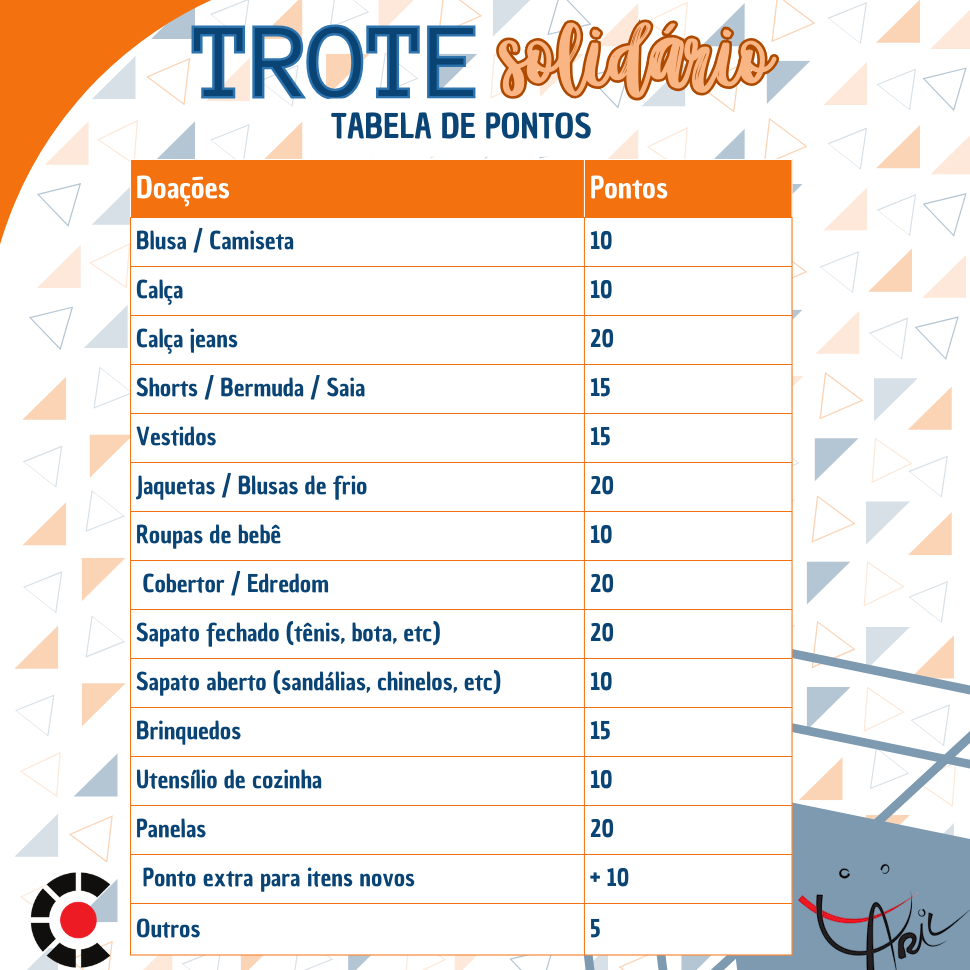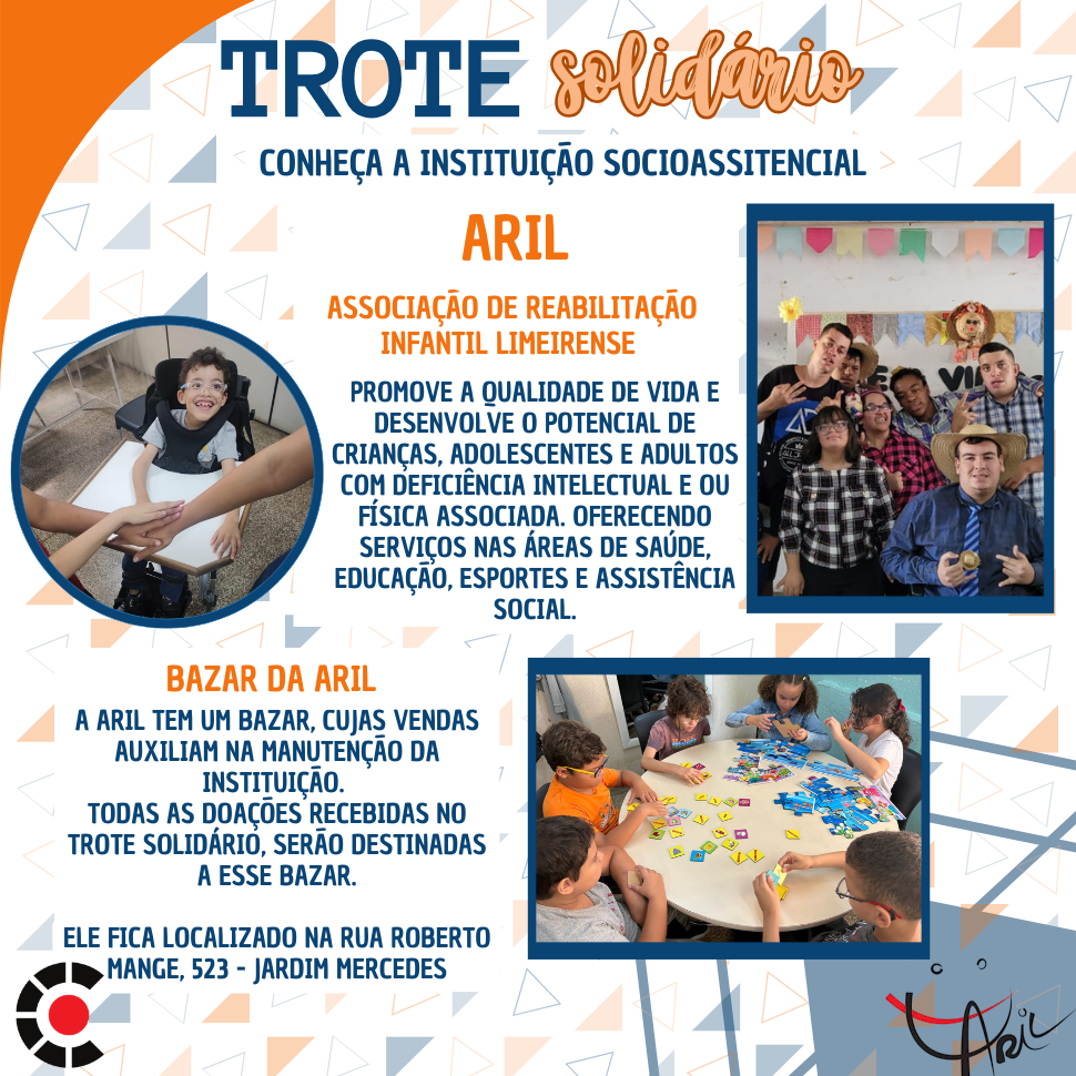 Além das atividades, o Trote Solidário contará com a arrecadação de roupas, roupas de cama, sapatos, brinquedos e utensílios de cozinha, novos ou usados em bom estado que serão destinados ao Bazar da ARIL, contribuindo para a reabilitação infantil. A participação de todos os alunos é fundamental, tanto nas atividades quanto nas doações.
